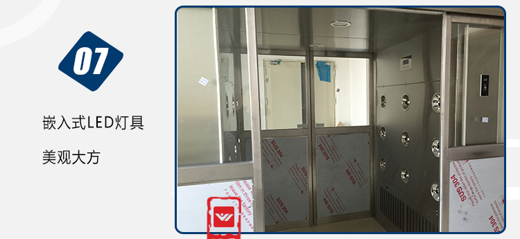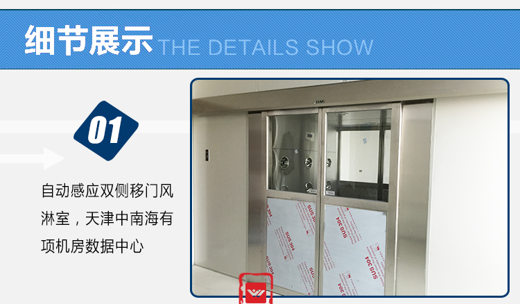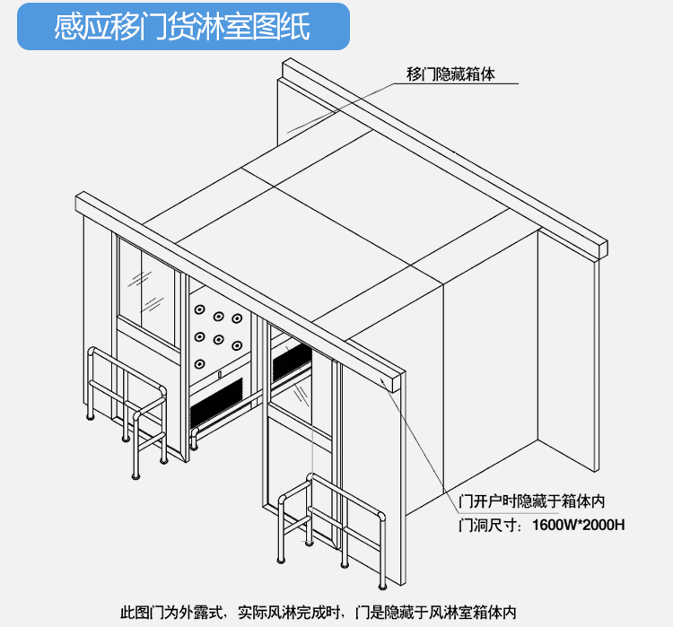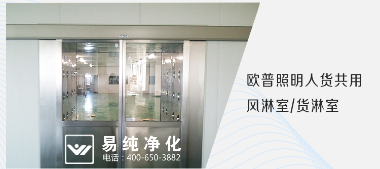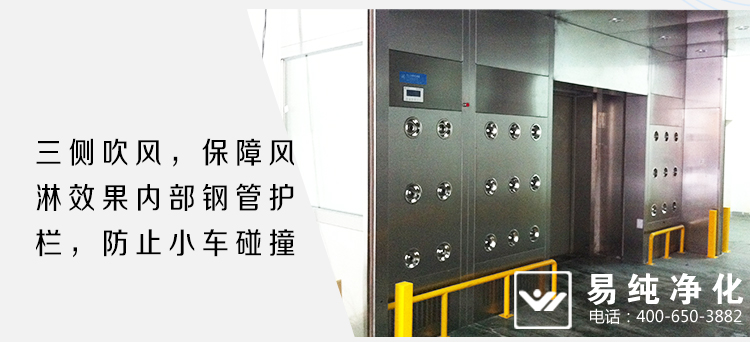 自動感應門貨淋室,由雙樘自動感應門和風淋室箱體組成,雙門為自動感應型開啟和自動關閉,雙門在吹淋過程中聯鎖,無法同時打開,將進入車間物流表面的灰塵和浮埃吹落。